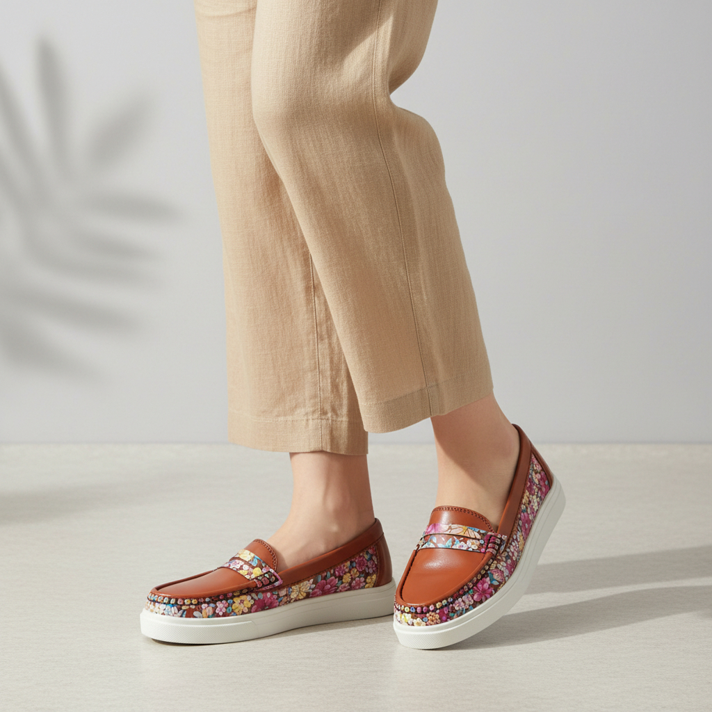 A unique brown loafer with a floral print design. Adds a hint of personality and charm while maintaining a refined style.